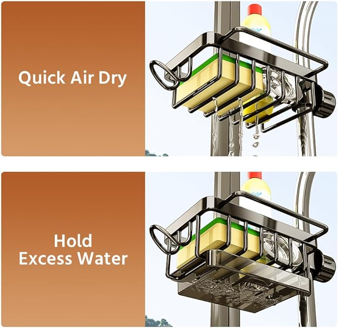 The faucet sponge holder can be used not only for the kitchen sink but also for the bathroom to store shampoo, soap and other items, eliminate clutter and better organize your sink and countertops. This faucet holder is very suitable for your kitchen and bathroom.